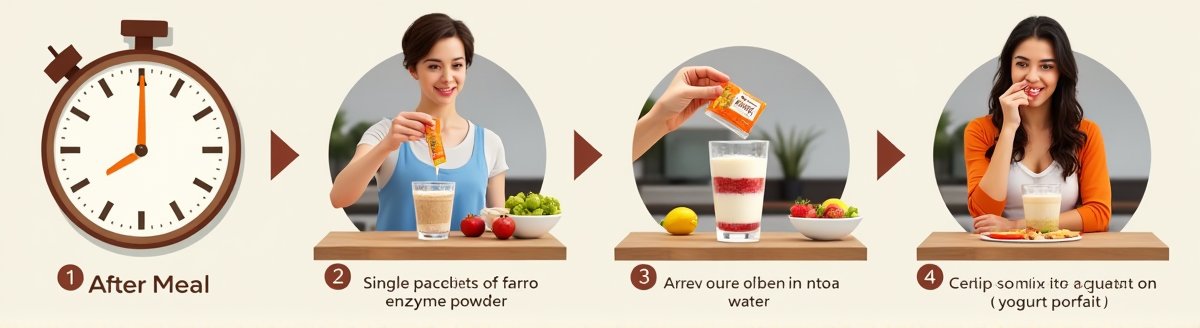 식사 직후 30분 이내에 섭취하는 것이 정답입니다. 이때 섭취하면 방금 들어온 음식의 소화를 직접 도와 부담을 줄이고, 혈당 상승 억제 효과도 함께 누릴 수 있습니다. 공복에 먹는 것은 추천하지 않습니다.