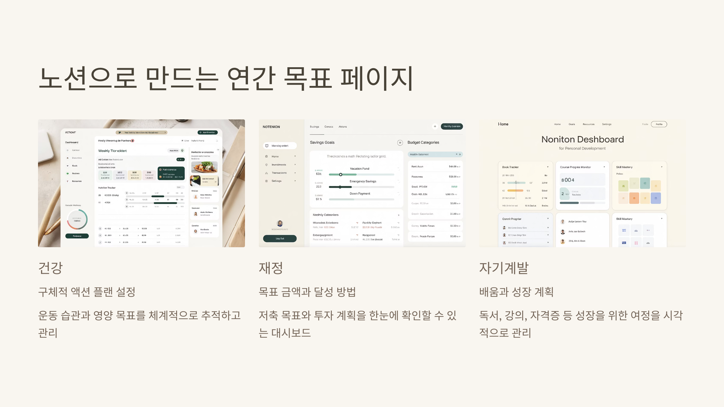 연간 목표를 세울 땐 “무엇을, 왜, 언제까지”가 명확해야 해요. 저는 ‘건강’, ‘재정’, ‘자기계발’ 이렇게 세 가지 카테고리를 중심으로 세웠고, 각 항목 아래 구체적인 액션 플랜을 덧붙였습니다. 노션의 '타임라인 블록'을 사용하면 시각적으로 일정이 보이기 때문에 진척도를 체크하기도 쉬워요. 연간 목표 페이지는 마치 나만의 인생 플래너 같답니다.